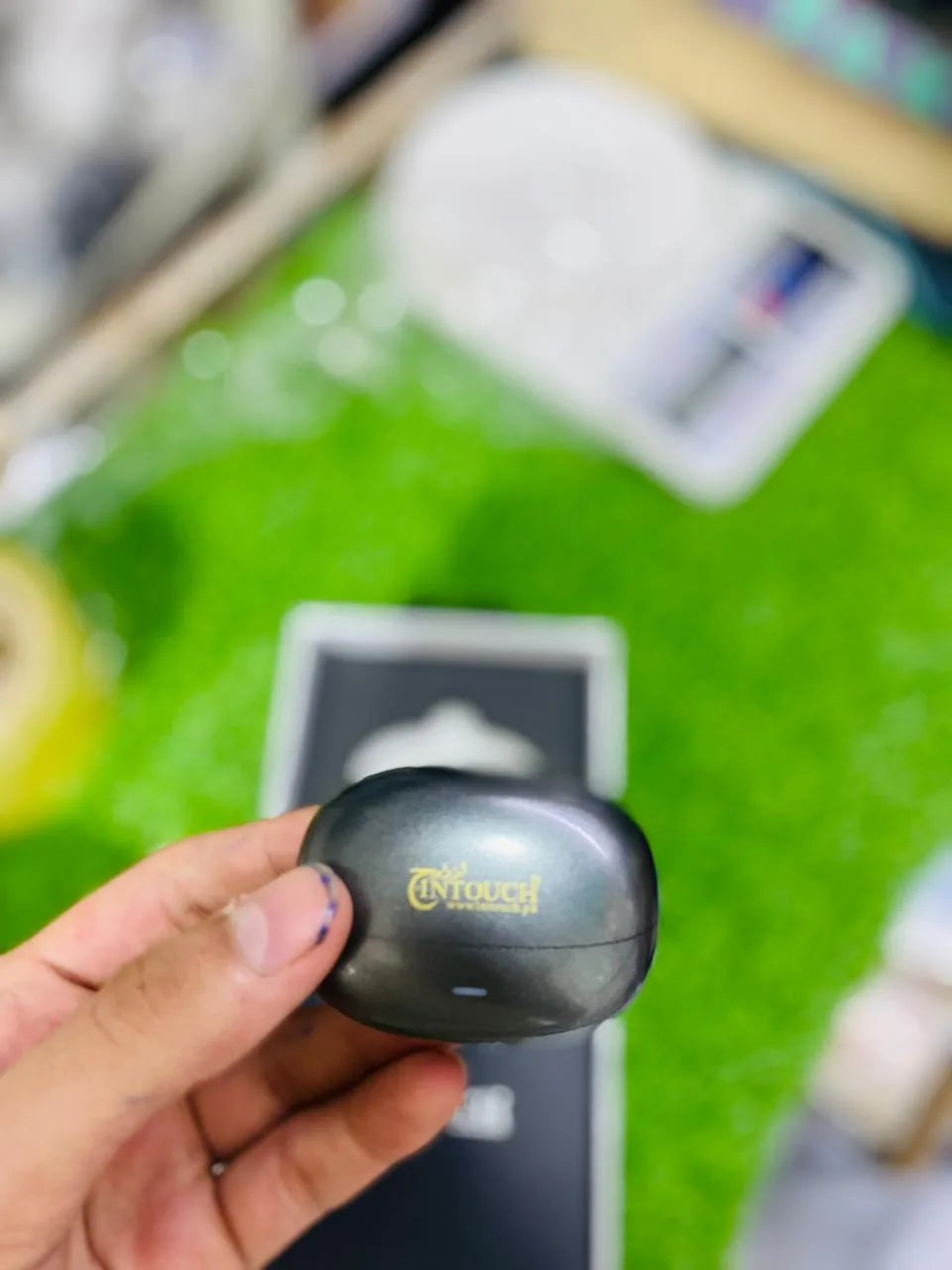 ✨ Sleek Design & Premium Finish The glossy black earbuds and metallic charging case exude sophistication. With the InTouch branding and LED indicator on the front, it’s a stylish accessory that complements your tech setup.